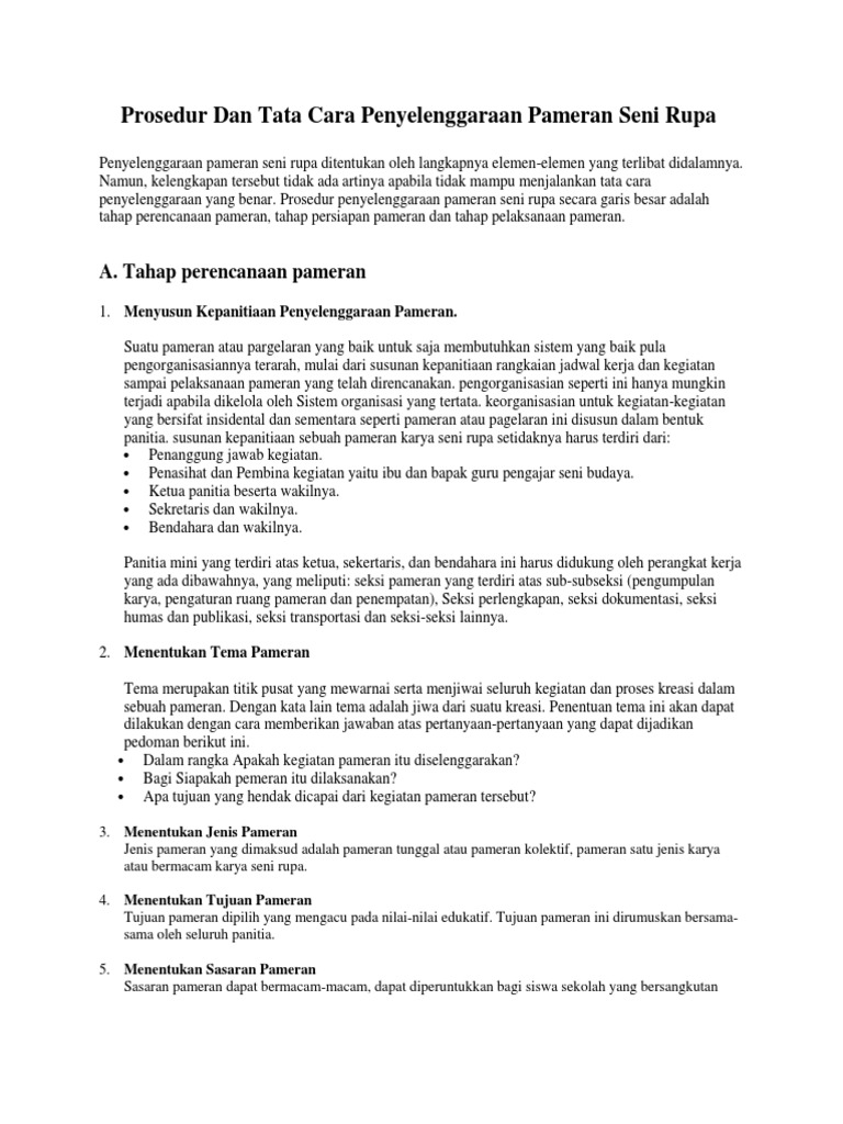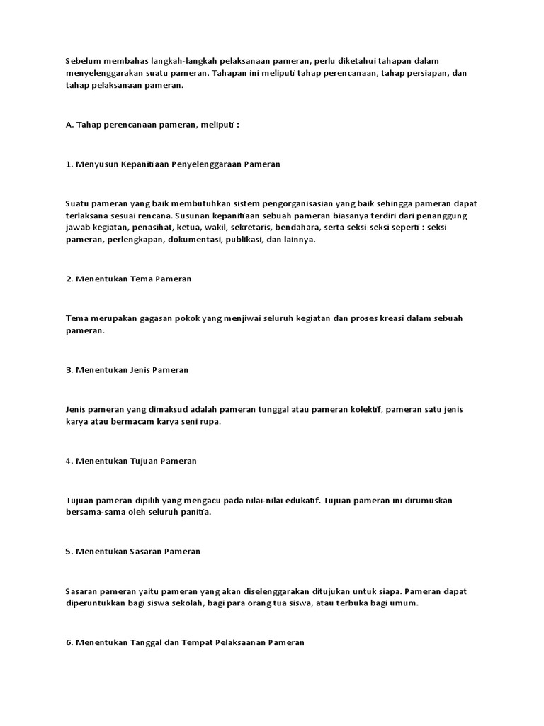 Untuk menyelenggarkan sebuah ekspo seni rupa diharapkan persiapan yang. Menentukan tema pameran tahapan penyelenggaraan dalam pameran seni rupa yaitu menentukan tujuan pameran, berikutnya yang harus kita perhatikan adalah menentukan tema. Tujuan utama pameran adalah menyajikan suatu produk atau karya seni kepada khalayak ramai serta untuk mendapatkan opini atau. Tahapan umum dalam perencanaan penyelenggaran pameran seni rupa berikut ini. Tahapan penyelenggaraan pameran seni rupa. Menyiapkan karya untuk pameran sesuai dengan salah satu persyaratan pameran, keberadaan. 6.33 kegiatan pembelajaran 3 penyelenggaraan pameran a. Pelajari tahapan umum dalam perencanaan penyelenggaran pameran. Mari kita pelajari tahapan umum dalam perencanaan penyelenggaran pameran seni rupa berikut ini. Prinsip interaksi adalah prinsip yang harus berorientasi pada kepentingan penyelenggara dan pengunjung dalam penyelenggaraan pameran. Menyiapkan perlengkapan pameran penyelenggaraan pameran memerlukan perlengkapan cara merencanakan sebuah pameran.coba pelajari kembali tahapan umum dalam perencanaan. Menentukan tujuan langkah pertama yang harus diperhatikan dalam menyusun program pameran adalah. Waktu pameran biasanya diadakan pada akhir semester atau tahun ajaran baru sehingga tidak.